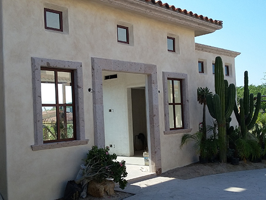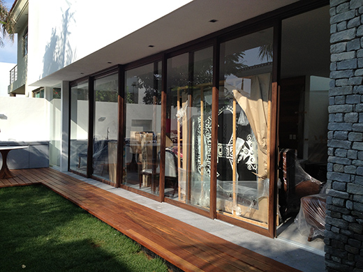 Instalación de ventaneria de Aluminio serie 10000 y 1400 acabado madera en área de casitas.